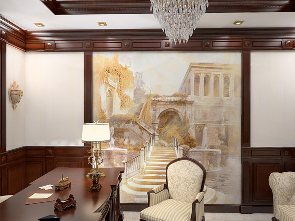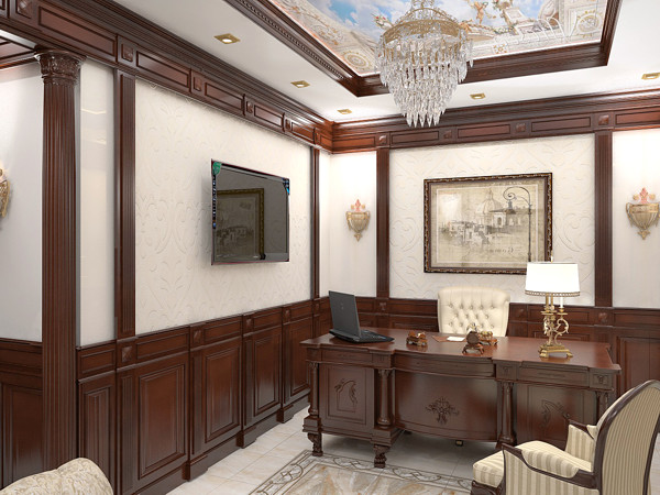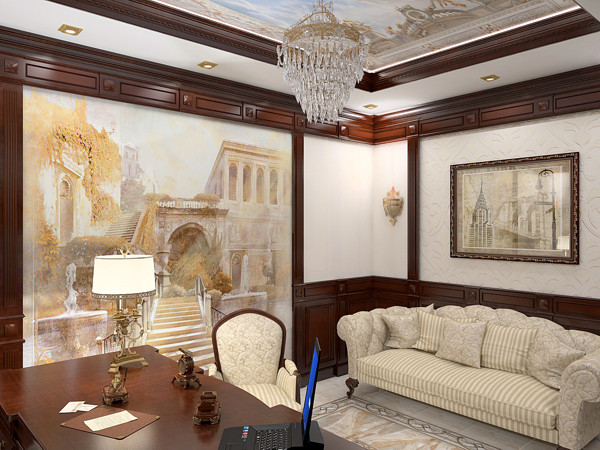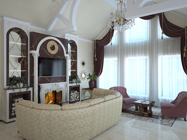 Идеи для интерьера загородного дома подсказаны самой планировкой дома и вкусами заказчиков .Необычная планировка совмещенной гостиной с кухней и холлом, позволили дизайнерам сделать необычно интересный дизайн в стиле неоклассицизма -помещение выглядит как единый ансамбль,дополнением служат потолки и декоративный балкон.Все остальные комнаты выполнены в той же стилистике.Хамам в восточном стиле и бассейн с панорамой и декоративными колонами с светильниками, служат заключительными аккордами этой архитектурной симфонии.
