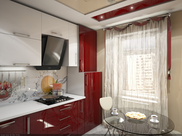 В современном интерьере квартиры дизайн маленькой кухни наиболее сложная задача,так как необходимо сделать ее функциональной и  интересной ,в этом проекте удалось решить не только эти задачи,но и придать интерьеру неповторимое своеобразие за счет цветовой гаммы фасадов и приемов декорирования.